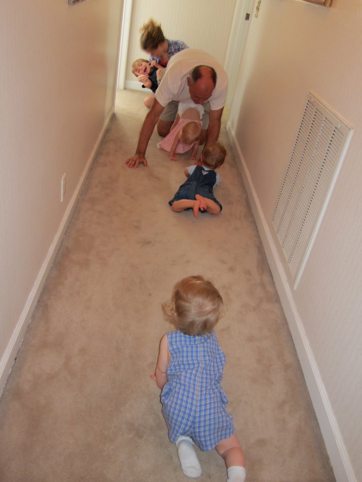Crawling Class 101. Everyone is trying to teach Briley how to crawl.
