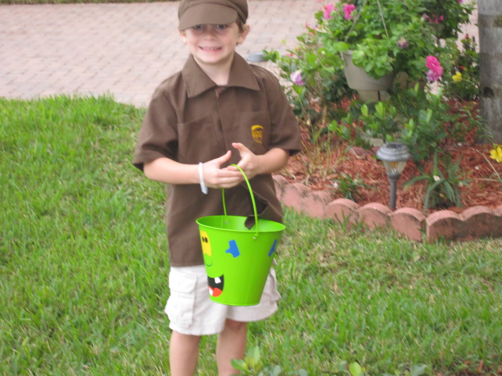 Call me crazy, but we gave the UPS outfit one more go. However, I decided to throw in a little package with his costume :) Last week, I decided that I wanted to attempt to make a UPS package costume for Mackenzie. I went to the UPS store and told them my idea. They LOVED it and gave the materials to me for free on one condition...I bring pictures (which I'm working on getting them there). The costume materials were as follows: UPS plastic envelop, pink